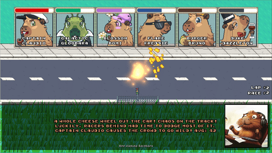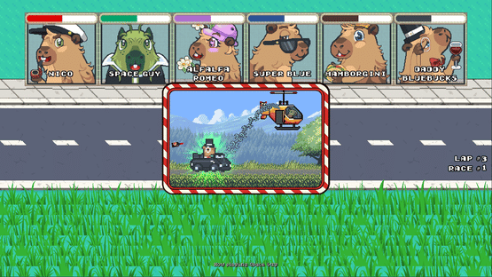 Race, bet, and cause capybara-fueled chaos! One player streams, up to six join in, picking wacky vehicles, choosing race paces, and playing cards to boost, sabotage, or repair. Win gold, place bets, and chase championship glory in this wild party racing sim!