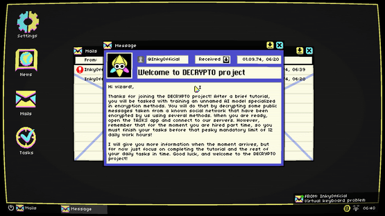 Our algorithm has chosen you for inclusion in the Decrypto Project. Your job is simple: we send encrypted texts, you decipher them. Loyalty and diligence will be rewarded with upgrades and customization options for your system. Disobedience and sabotage will be punished.
