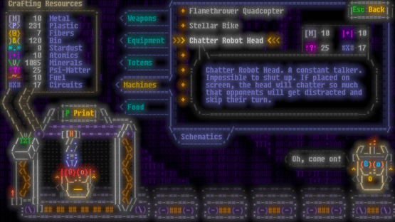 Effulgence is a party-based RPG in a sci-fi setting. Players will explore a distant, possibly extinct world, battle its hostile inhabitants, craft gear, and develop their characters. All graphics in Effulgence are made of text symbols, making it visually unique.