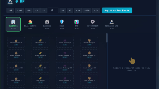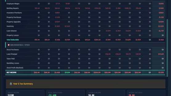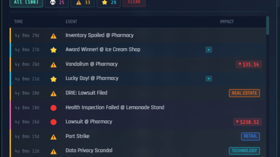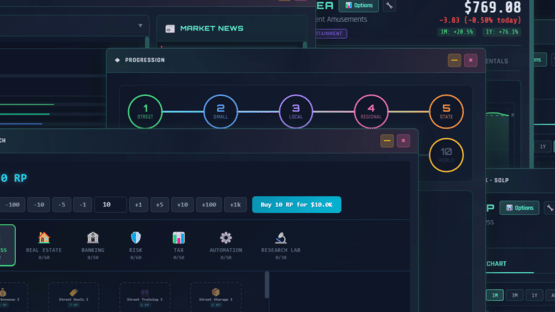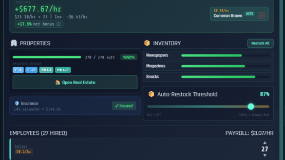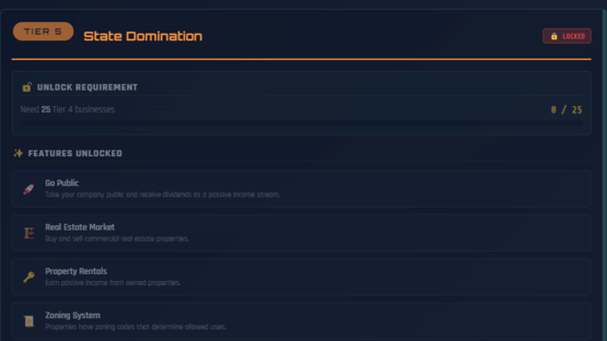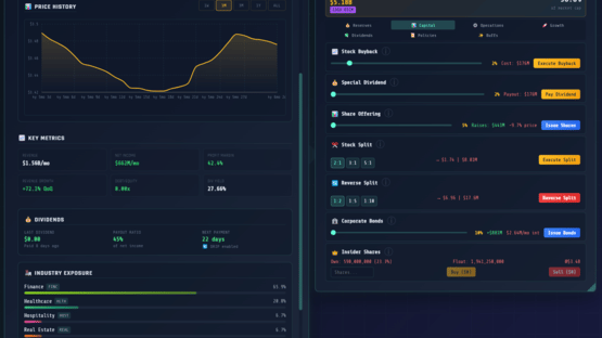 Multiplayer Incremental Idle tycoon with a stock market that actually works. 200 stocks, real options pricing, Fed rate decisions, 55 businesses across 10 tiers, real estate, banking, taxes, and a 530-node research tree. Multiplayer shares one market. There's also a casino.