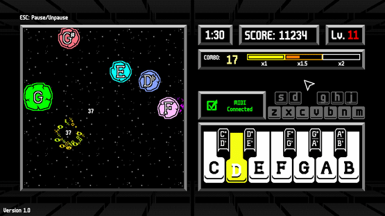 Blast meteors in this retro-style arcade game with a musical twist! Use your keyboard or plug in a MIDI piano to methodically (and melodically) destroy the oncoming meteors. Shoot for high scores, rack up massive combos, and develop your piano dexterity along the way!